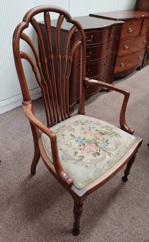 Early 20th century mahogany shell back open armchair with floral tapestry seat on ring turned supports