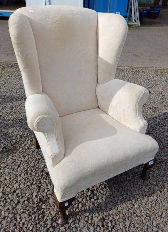 Overstuffed wingback armchair on queen anne supports