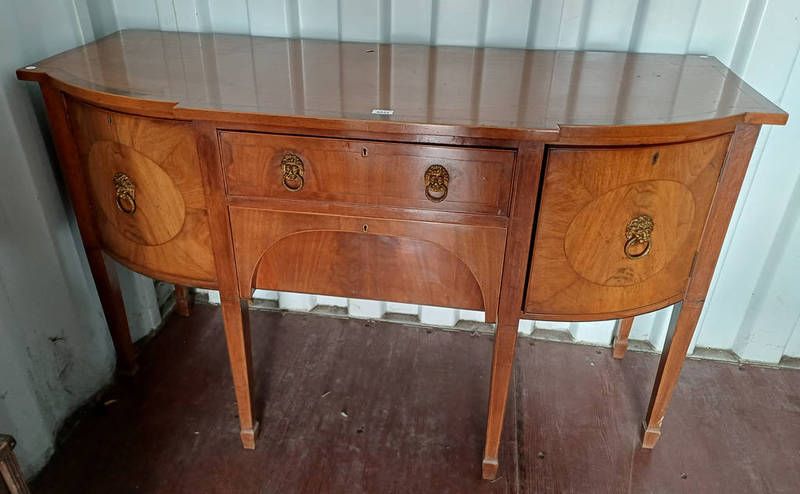 Georgian style inlaid mahogany sideboard with 2 centrally set drawers flanked by 2 panel doors with lion mask handles on square tapered supports, 153cm wide