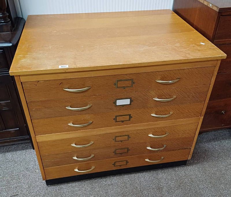 Mid 20th century oak multi drawer plan chest on plinth base - 52cm tall x 95 cm wide x 72 cm deep