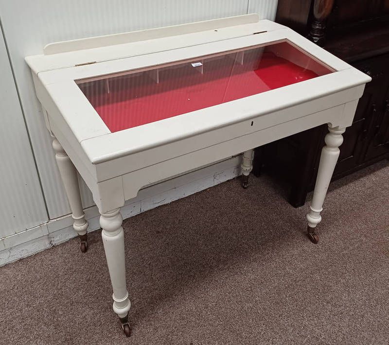 Late 19th century painted desk/display table with glass inset slope top on turned supports - 92 cm tall x 106 cm wide