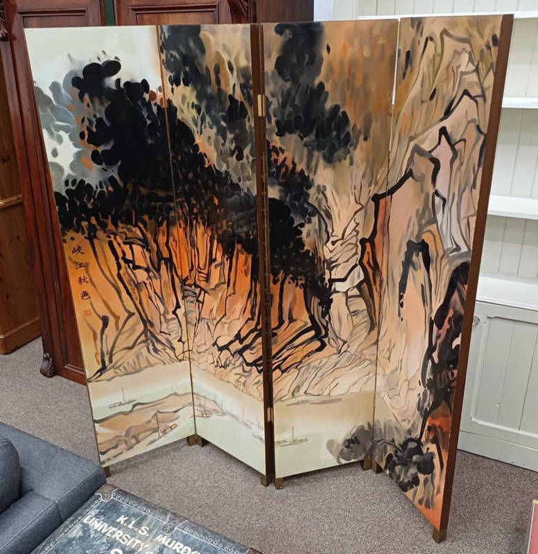 Painted 4 part folding room divider with foliage decoration & oriental lake scene decoration - 177 cm tall