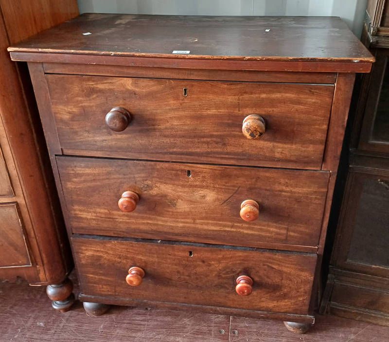 19th century mahogany 3 drawer chest on bun feet, 93cm tall x 83cm wide