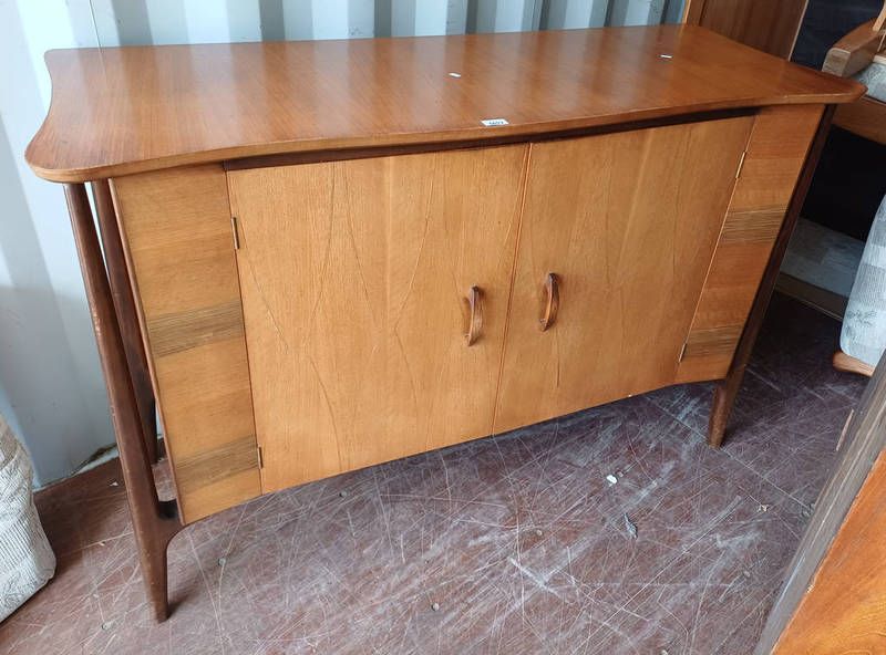 Mid 20th century teak sideboard with shaped top & 2 panel doors, labelled everest to interior, 97cm tall x 139cm long