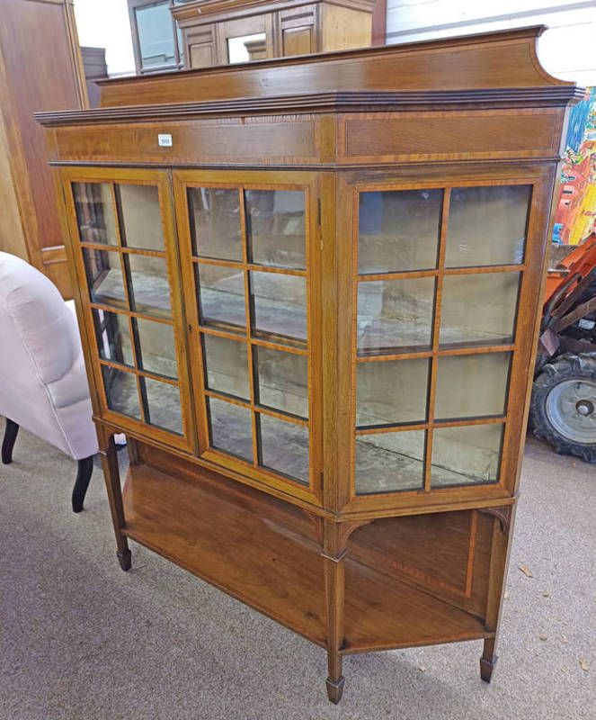 Early 20th century inlaid mahogany display cabinet with 2 glazed panel doors over undershelf on square tapered supports - 148 cm tall x 145 cm wide