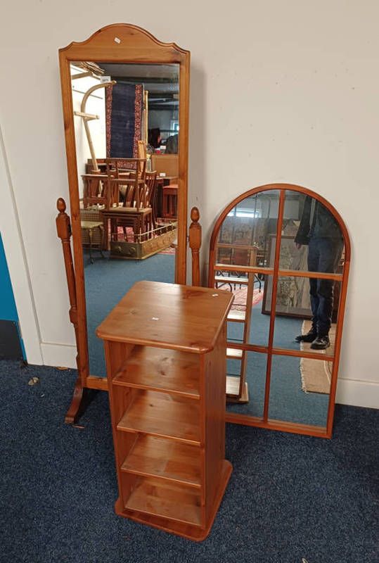 Pair of pine kitchen chairs, 2 demi-lune side tables, oak dressing table mirror, etc