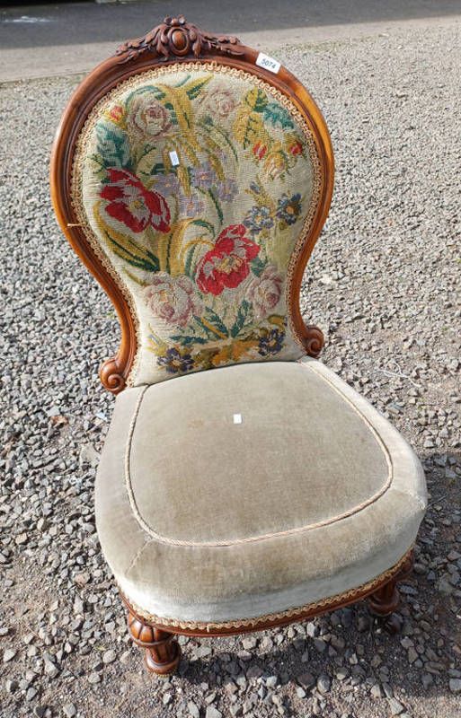 19th century mahogany ladies chair with floral tapestry back on decorative reeded supports