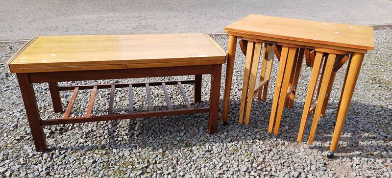 Teak coffee table with 2 draw leaves & nest of 4 teak tables