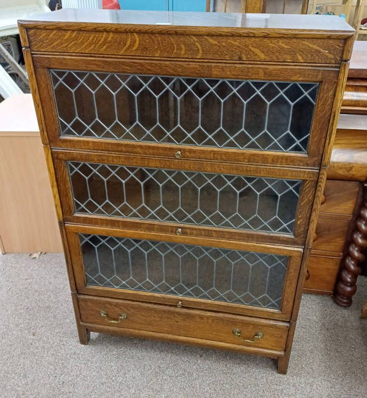 20th century oak sectional bookcase with 3 leaded glass panel doors & single drawer to base - 128 cm tall x 87 cm wide