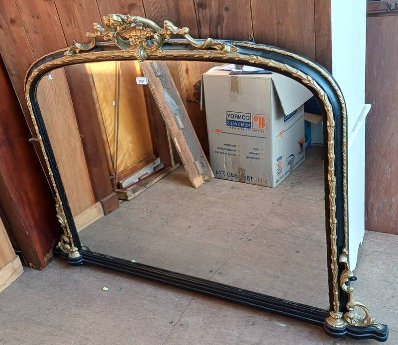 Decorative black & gilt framed overmantle mirror, glass 82cm x 108cm