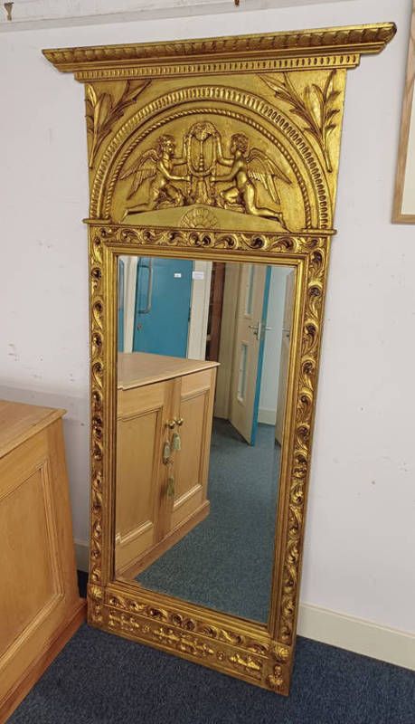 Large gilt framed pier mirror with cherub decoration and beveled edge - glass 120 cm x 60 cm