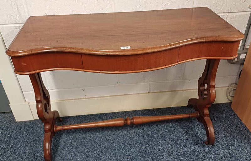 19th century mahogany side table with shaped front & single drawer on shaped supports with turned under stretcher - 73 cm tall x 101 cm wide