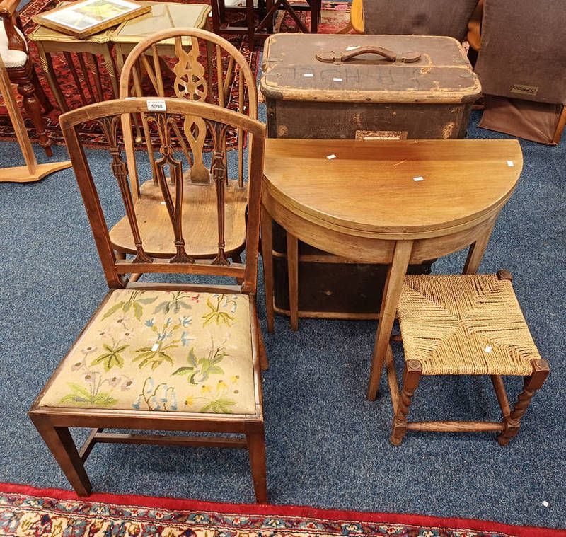 Elm wheel back chair, mahogany demi - lune turnover tea table, etc.