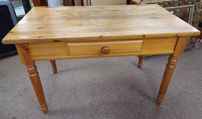 Pine rectangular kitchen table with single drawer on turned supports - 121 cm long