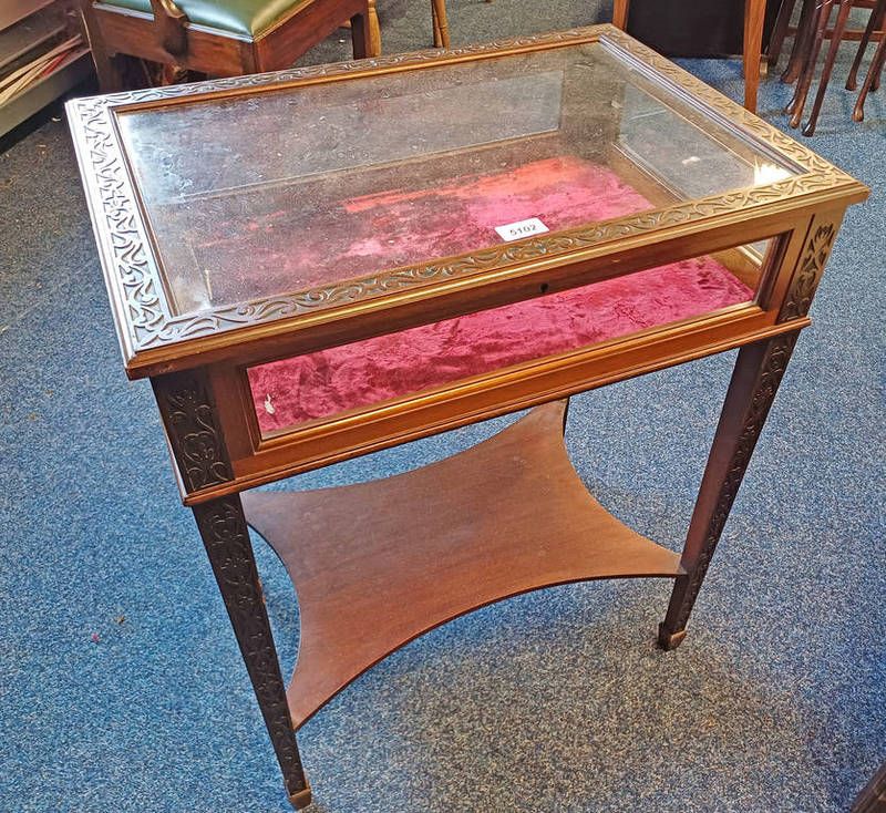 Mahogany bijouterie table with carved decoration, shaped under stretcher & square tapered supports - 74 cm tall x 60 cm wide x 42 cm deep
