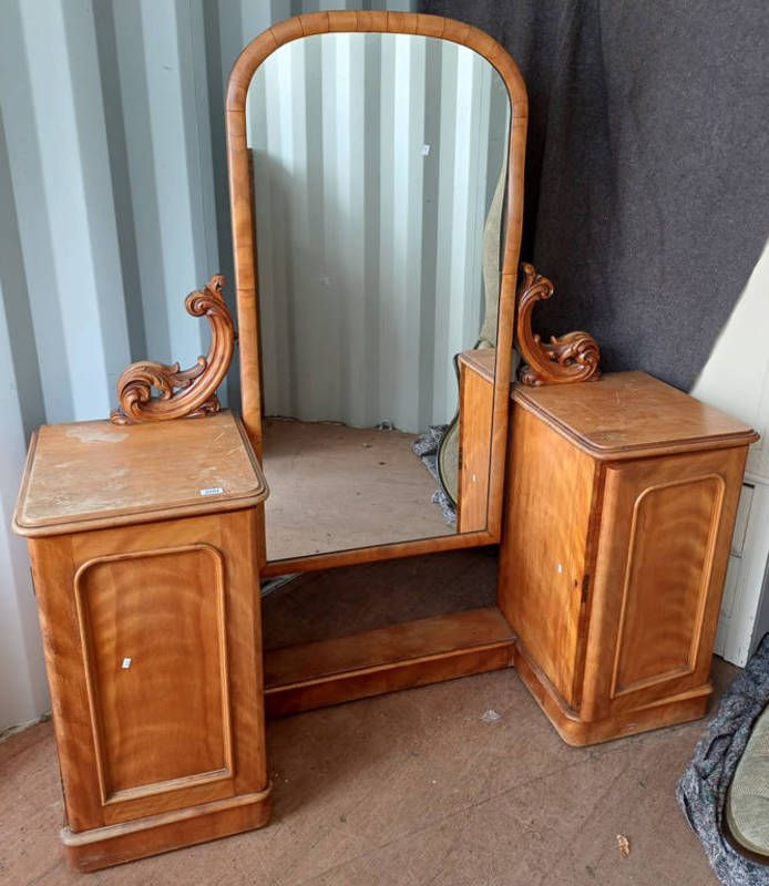 19th century satin birch dressing table with centrally set swing mirror flanked to each side by panel door on plinth base