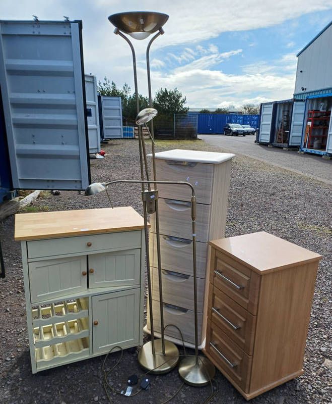 White & beech kitchen cabinet, 5 drawer chest, etc