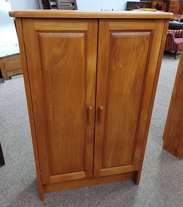 Hardwood 2 door cabinet opening to shelved interior - 117 cm tall x 76 cm...