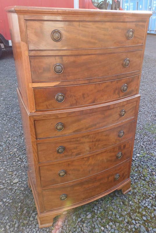 20th century mahogany chest with bow front & 7 graduated drawers, 119 cm tall x 65 cm wide