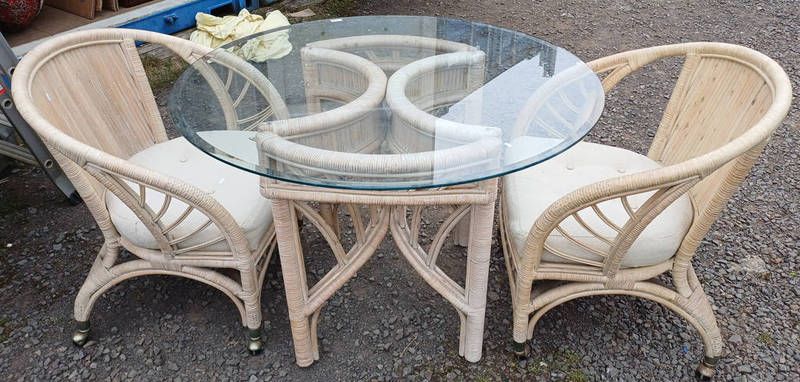 Glass topped circular table on wicker pedestal & wicker chairs