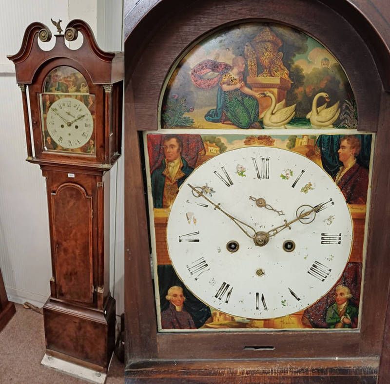 19th century inlaid mahogany longcase clock with eagle finial. the painted dial decorated with 4 scottish poets, burns, ramsay, scott & fergusson, unsigned