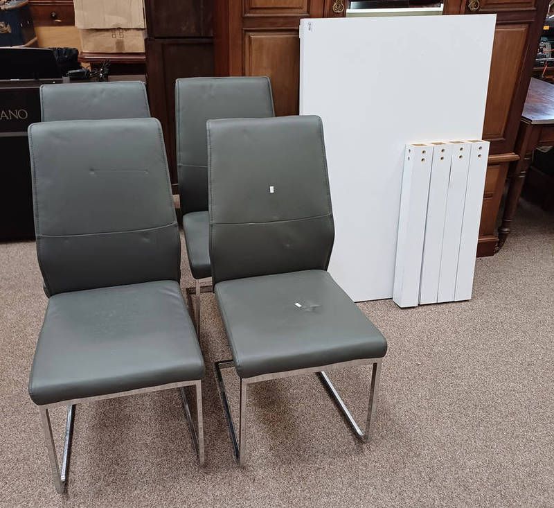 White rectangular dining table & set of 4 metal & grey leatherette cantilever dining chairs