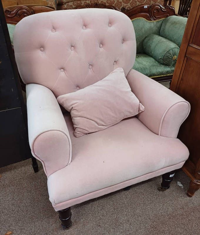 19th century easy chair style buttoned back armchair on ring-turned support