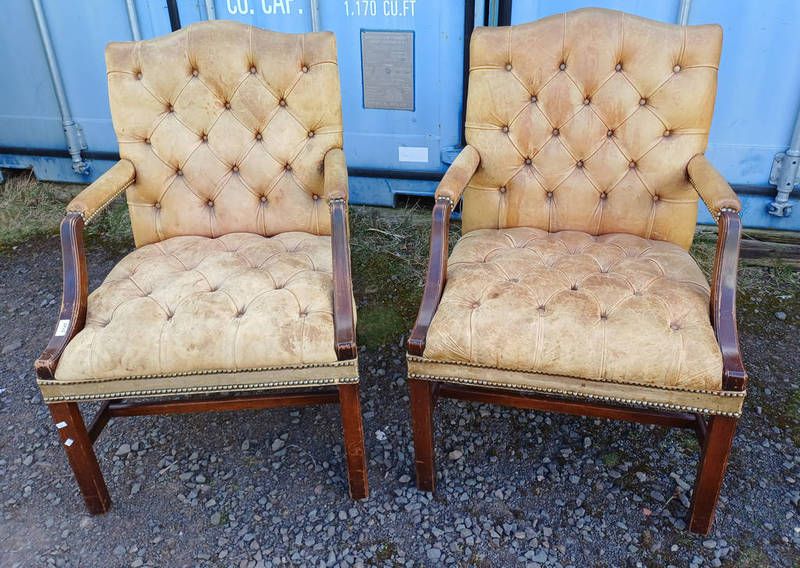 Pair of 20th century mahogany framed buttoned leather library armchairs on square supports