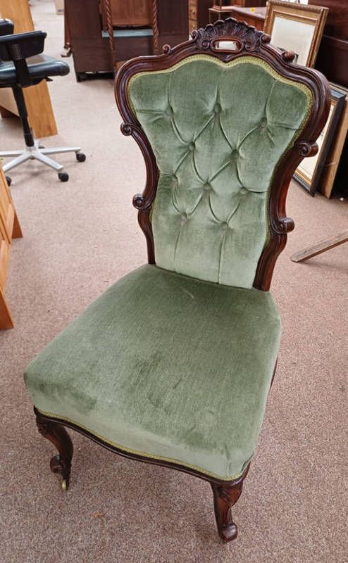 19th century carved mahogany buttoned back side chair on cabriole supports