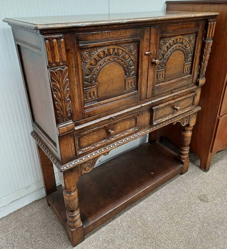 20th century carved oak cabinet with 2 panel doors over 2 drawers with pull-out slides above by titchmarsh & goodwin, ipswich - england. labelled to interior - 115 cm tall x 106 cm wide