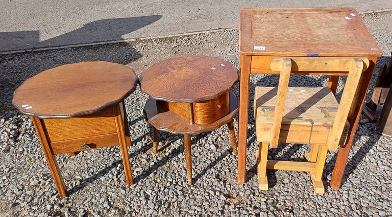 20th century oak sewing tables with shaped tops, child's desk etc