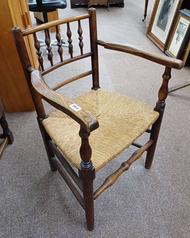 Early 20th century ash open armchair with rush work seat