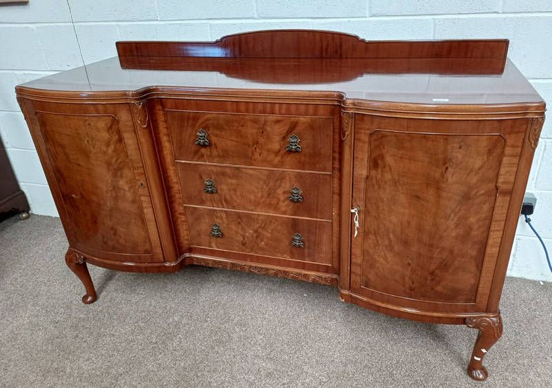 20th century mahogany sideboard with shaped front. the centrally set graduated drawers flanked to each side by 2 panel doors on queen anne supports -108 cm wide