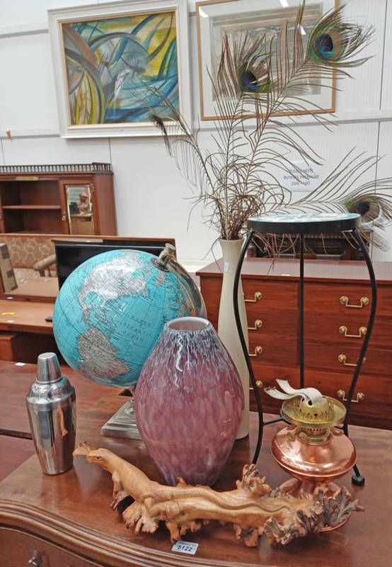 Oriental carved hardwood burr of a lizard, glass vase & pot stand, globe etc