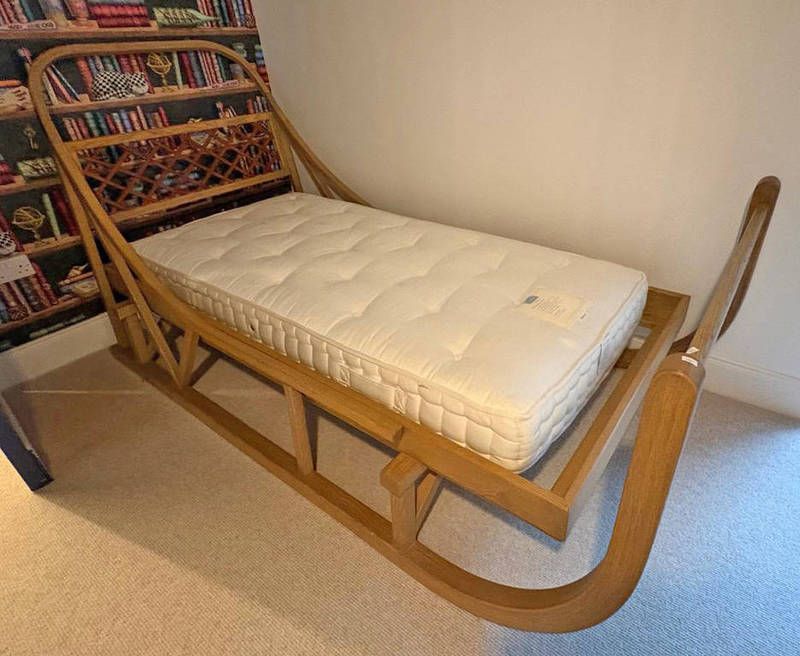 Pair of elm single sleigh bed frames with mattresses - 242 cm long
