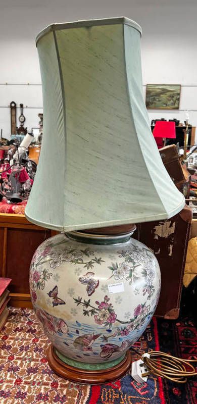 Large porcelain bodied table lamp decorated with birds, butterflies & foliage with shade 86cm tall