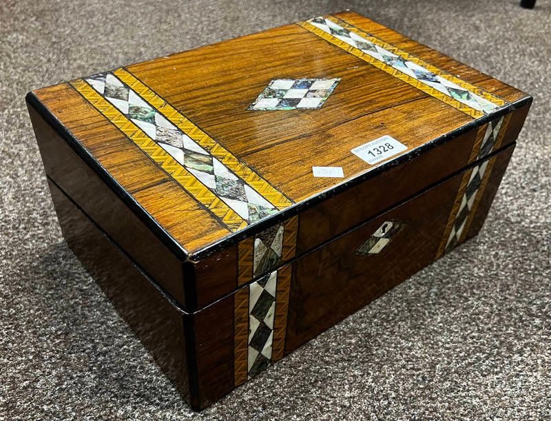 Late 19th or early 20th century mother of pearl inlaid writing slope with fitted interior, 35cm across