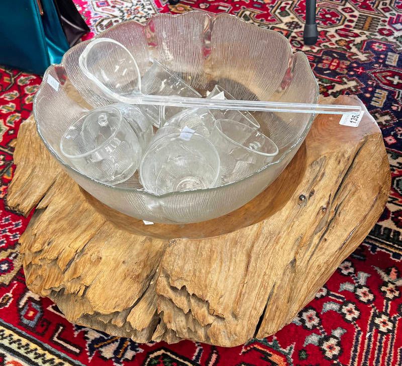 Rustic root wood bowl with glass punch bowl and glasses, 45cm across