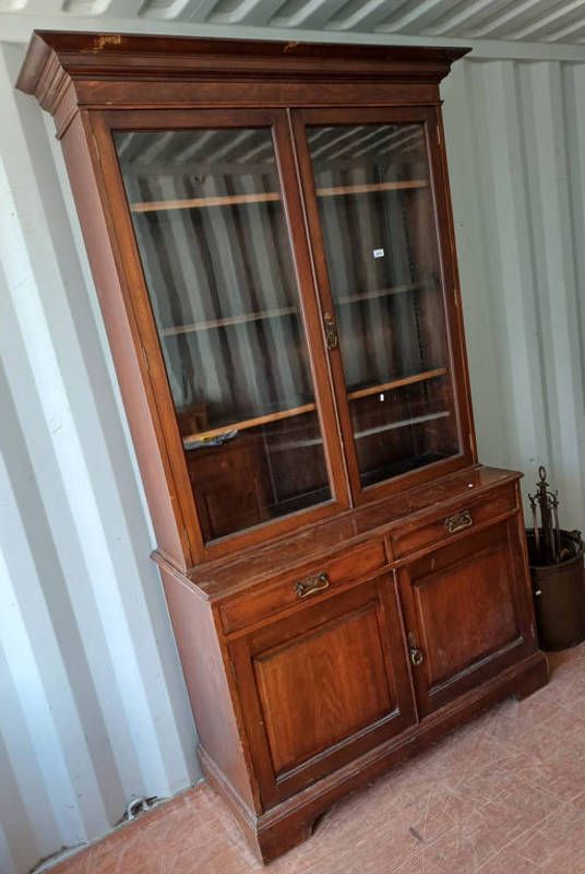 Late 19th century pine bookcase with 2 glazed doors over base of 2 short drawers over 2 panel doors - 222 cm tall x 122 cm wide