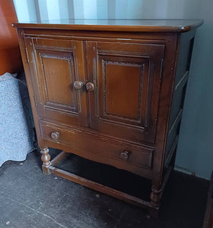Ercol oak cabinet with 2 panel doors over single drawer - 83 cm tall x 78 cm wide