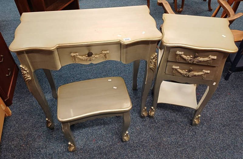 Silvered dressing table with single drawer, matching 2 drawer beside chest & stool