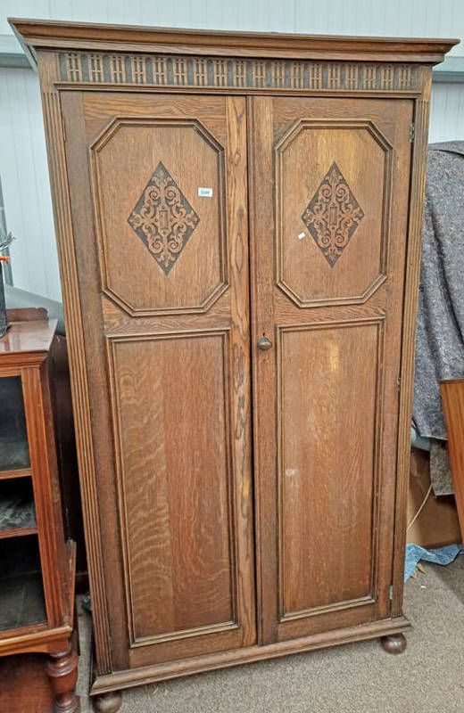 Early 20th century oak 2 door wardrobe on bun feet - 196 cm tall x 113 cm wide