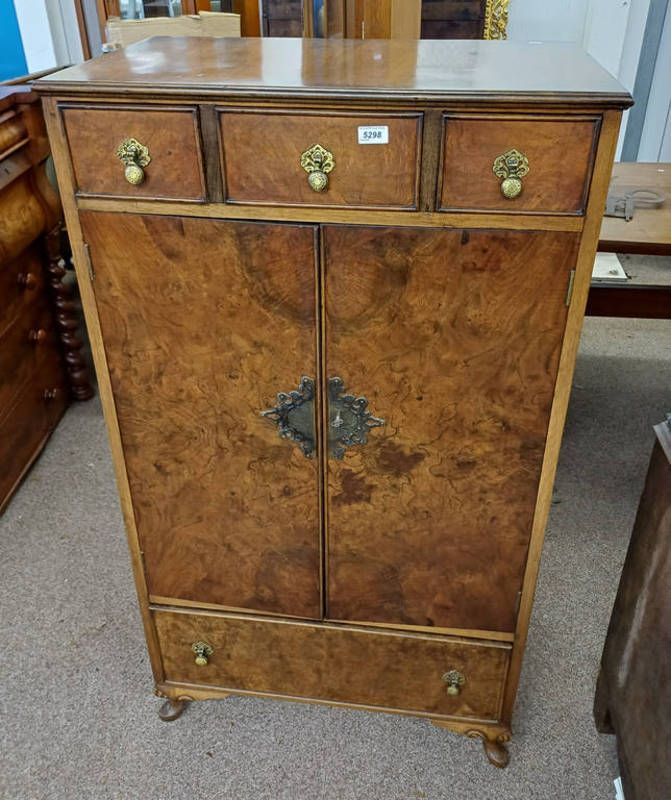 20th century walnut linen press. the 2 central panel doors with 3 short drawers above & single long drawer below on cabriole supports - 135 cm tall x 76 cm wide