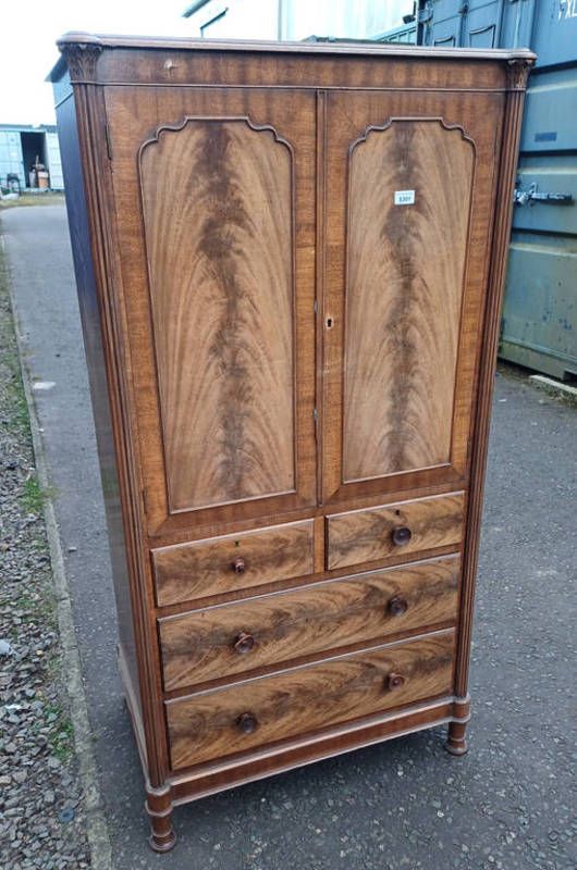 20th century walnut cabinet with 2 panel doors over 2 short & 2 long drawers with corinthian column decoration - no keys - 152 cm tall x 80 cm wide