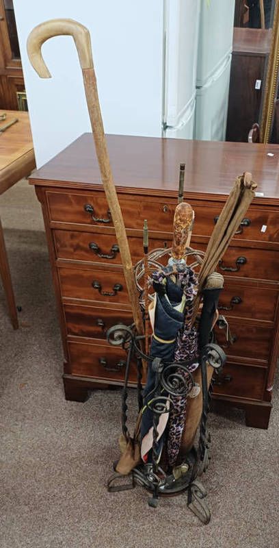 Decorative wrought metal stick stand, & contents to include shepherd's crook, fishing rod, cricket bat etc.