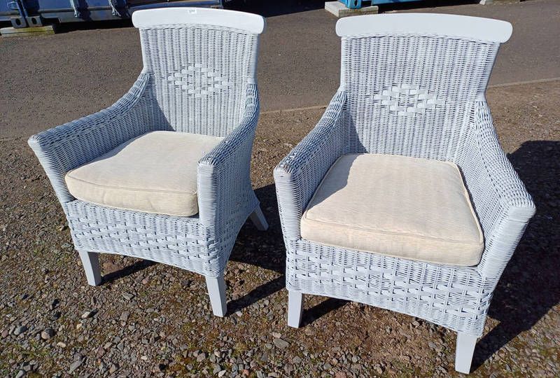 Pair of 3 drawer bedside chests, wicker chair, basket stool etc.
