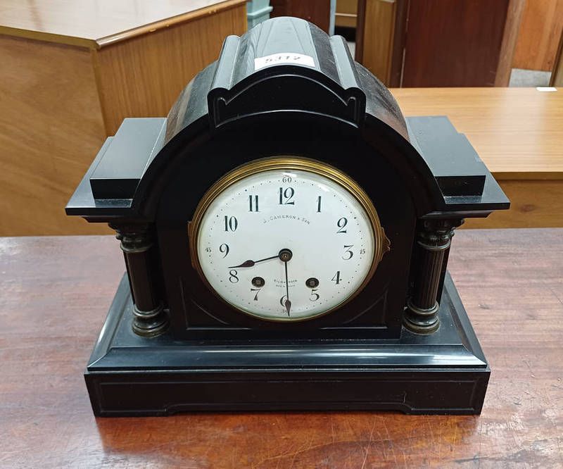 Early 20th century french black slate mantle clock the enamel dial signed j cameron & son, kilmarnock, made in france