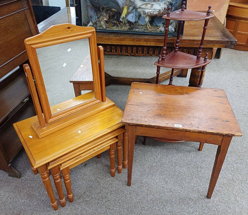 Pine table on tapered supports, nest of 3 tables, 4 tier corner what-not, etc