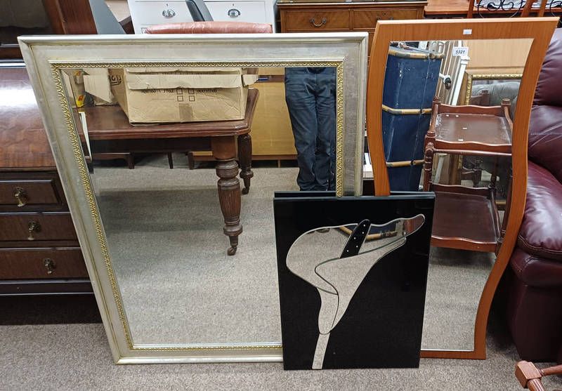 Large rectangular bevelled edge mirror with silvered frame, teak framed mirror with shaped frame, etc.