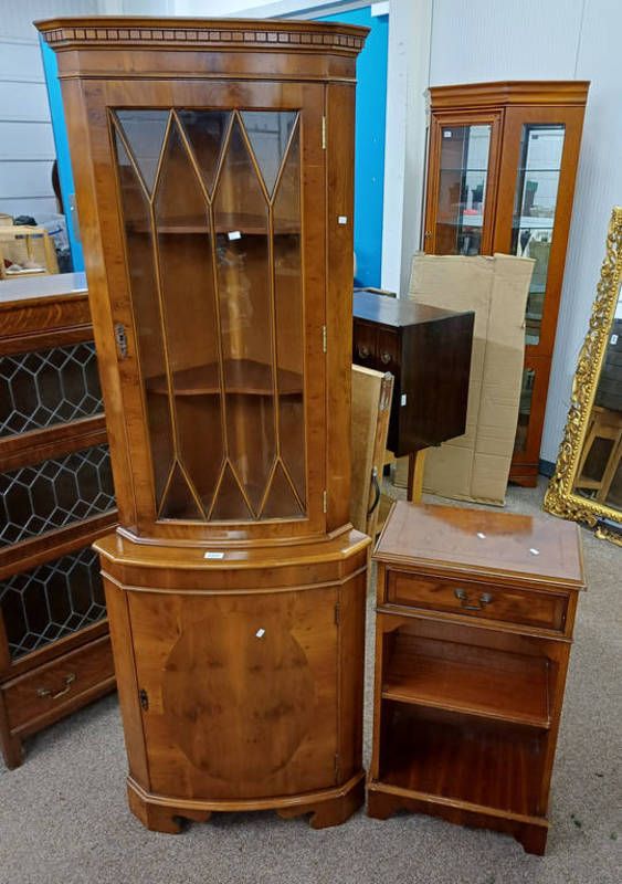 Yew corner cabinet with astragal glass panel door over panel door and yew small bookcase with single drawer
